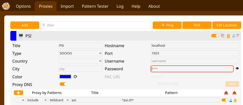 - activate any local PSI computer, eg gps, with -D 1025 (this port is the one selected in FoxyProxy/Options/Proxy)
